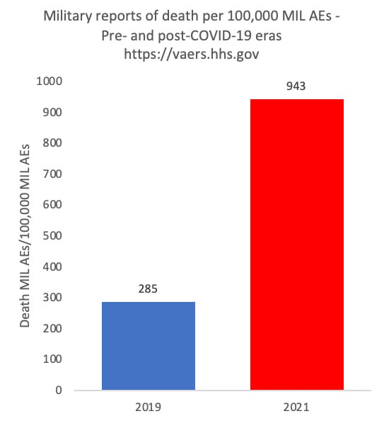 VAERS military death reporting rates increased 230% from 2019 to 2021