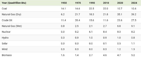 As seen in the video above, natural gas has experienced the most significant growth—rising from just 6.2 quadrillion BTUs in 1950 to 39.2 in 2024—making it the leading energy source in recent years, surpassing both coal and oil.