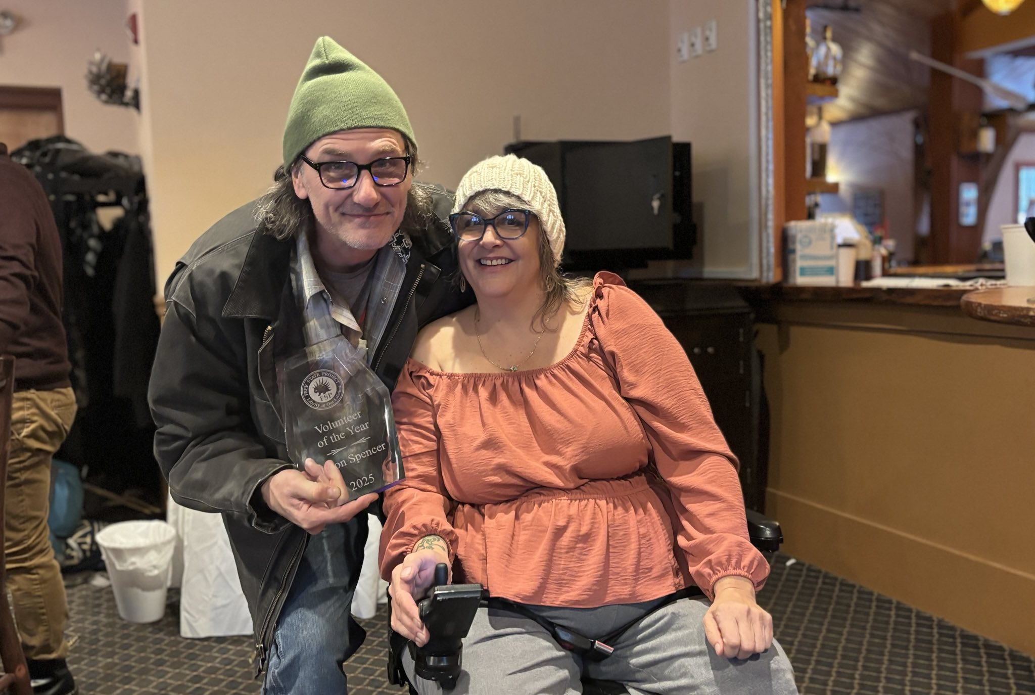 The Free State Project honored their amazing volunteers with a dinner last week. Top Photo: Full House! Middle Photo: The Outreach Team that talks with folks interested in moving to New Hampshire, and bottom photo: Volunteer of the Year Jason Spencer with Chris Lopez.