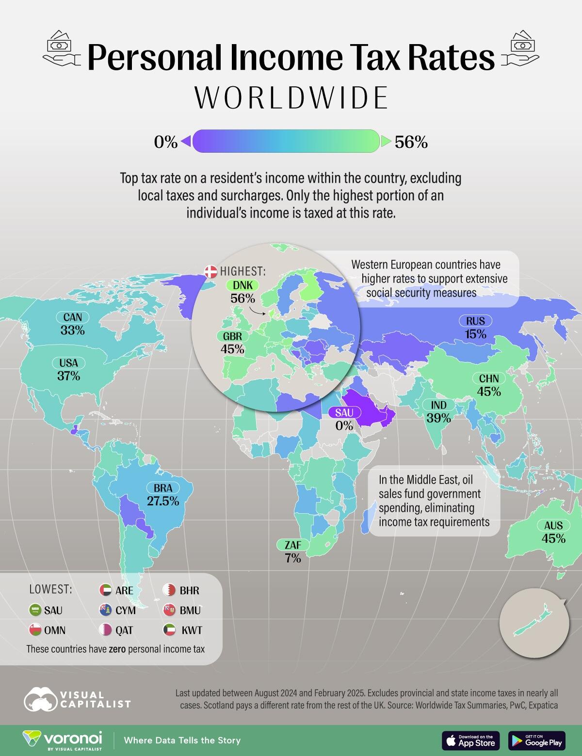 How differently do countries tax their citizens? Visual Capitalist's Pallavi Rao took a look at the top marginal individual income tax rates of nearly 150 countries to compare and contrast differences.