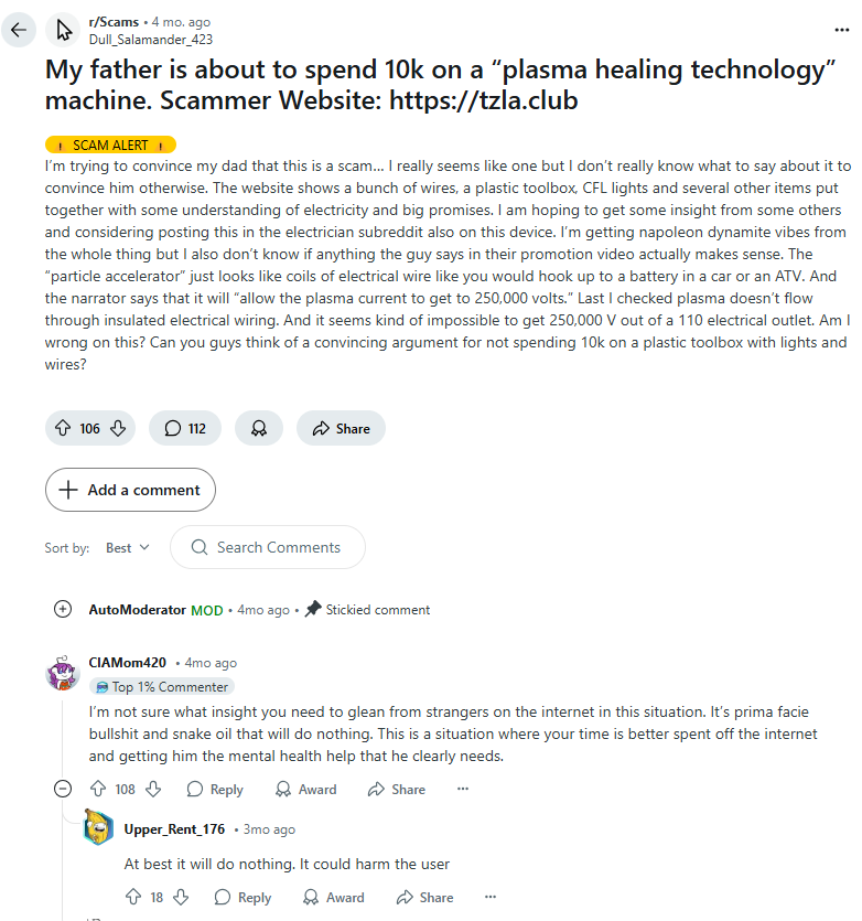 With respect to the TZLA machine, the device has now been featured on ScamFinders (video below) AND has popped up on r/Scam on Reddit (link below) where, as of this writing, every single review and comment rips the whole thing mercilessly with many pointing out there is no address, team, board members, or any other identifying information for someone to get their money back…