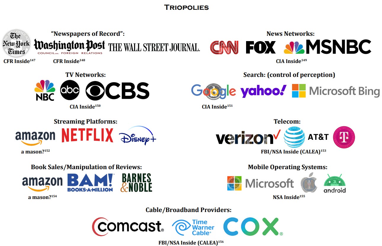 Fed-backed banks provide unlimited fractional reserve capital to Cartel companies to dominate and consolidate their industries, where they are usually owned and controlled by Blackrock and Vanguard, who appear to be managing the assets stolen through fractional reserve banking. At the same time, the executives (and their political and media puppets) are recruited, trained, organized and controlled under the World Economic Forum, Bilderberg Group, Council on Foreign Relations, Bergrueen Institute, Bohemian Club and other cartel front groups, policy shops, and secure private meeting venues.