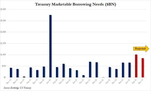 We gave a big picture preview of the debt flood (and fiscal crisis) that is coming to the US this past Monday when, looking at the latest Treasury debt estimates, we showed that the US predicted a near-record $1 trillion in debt sales in the current quarter (up from $$733BN forecast previously) and $852 billion in Oct-Dec quarter, numbers so staggering they are usually associated with economic crises...