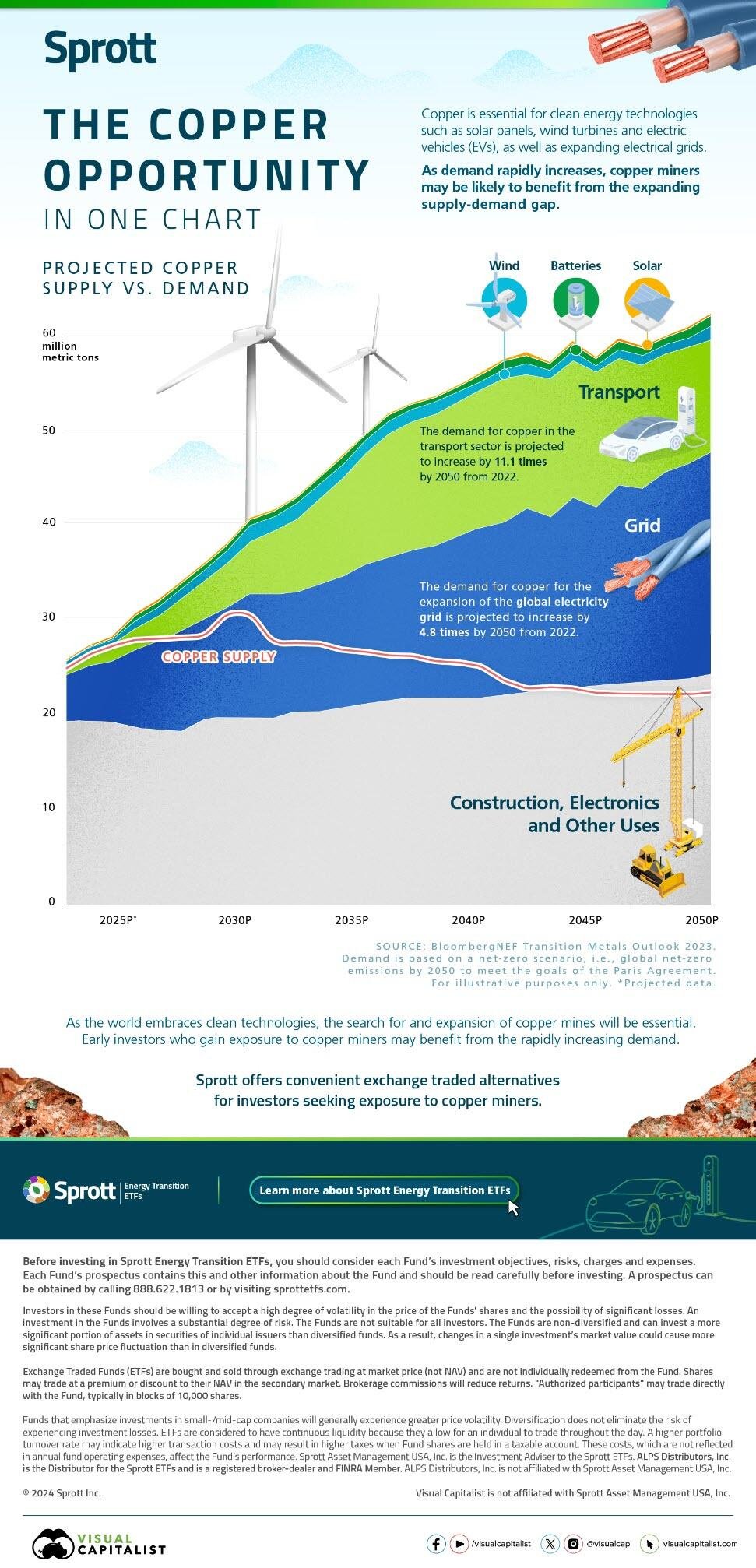 Visual Capitalist's Bruno Venditti introduces this chart by Sprott exploring the growing gap between copper supply and demand until 2050, based on projections from BloombergNEF’s Transition Metals Outlook 2023.