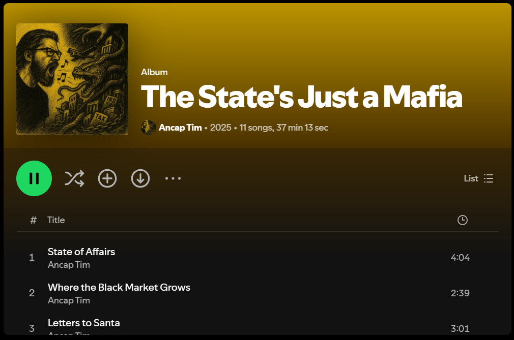 Hat Tip to Jaron Weidner at Libertarians Who Make Art for turning me on to AnCap Tim who just dropped the new album: The State’s Just a Mafia.