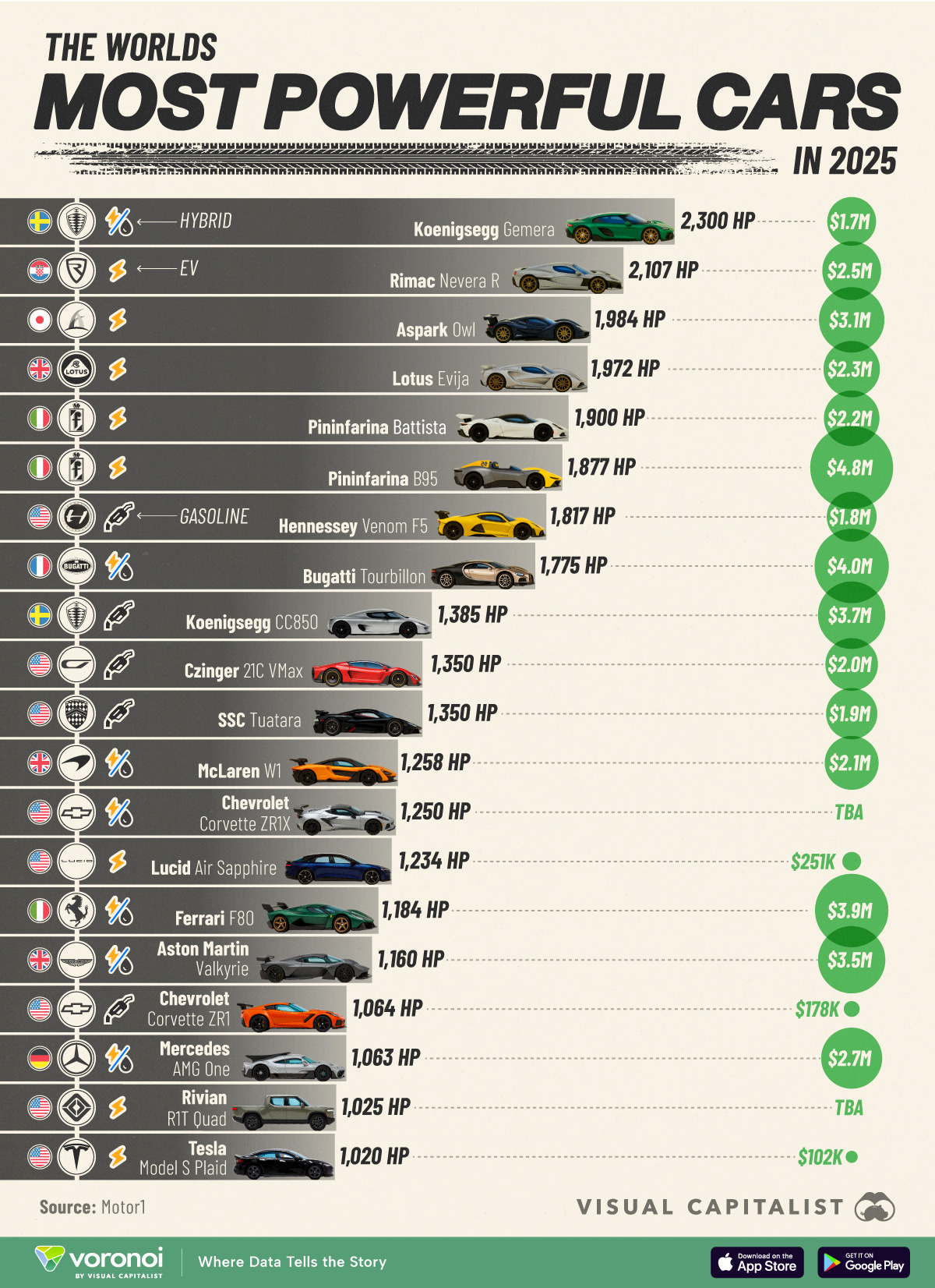 In this infographic, we rank the 20 most powerful cars of 2025, spanning gasoline, hybrid, and fully electric powertrains.