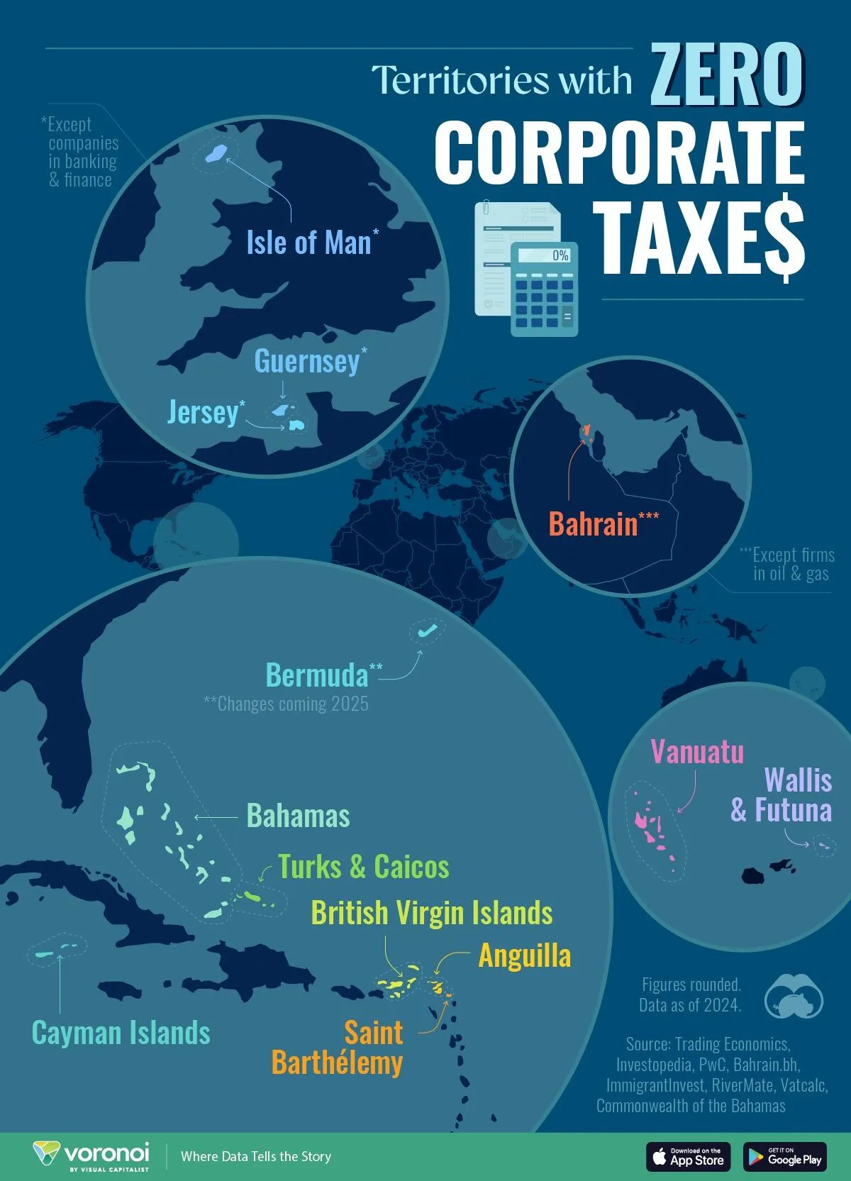 In the following graphic, Visual Capialist's Pallavi Rao maps the very short list of places with zero corporate taxes.