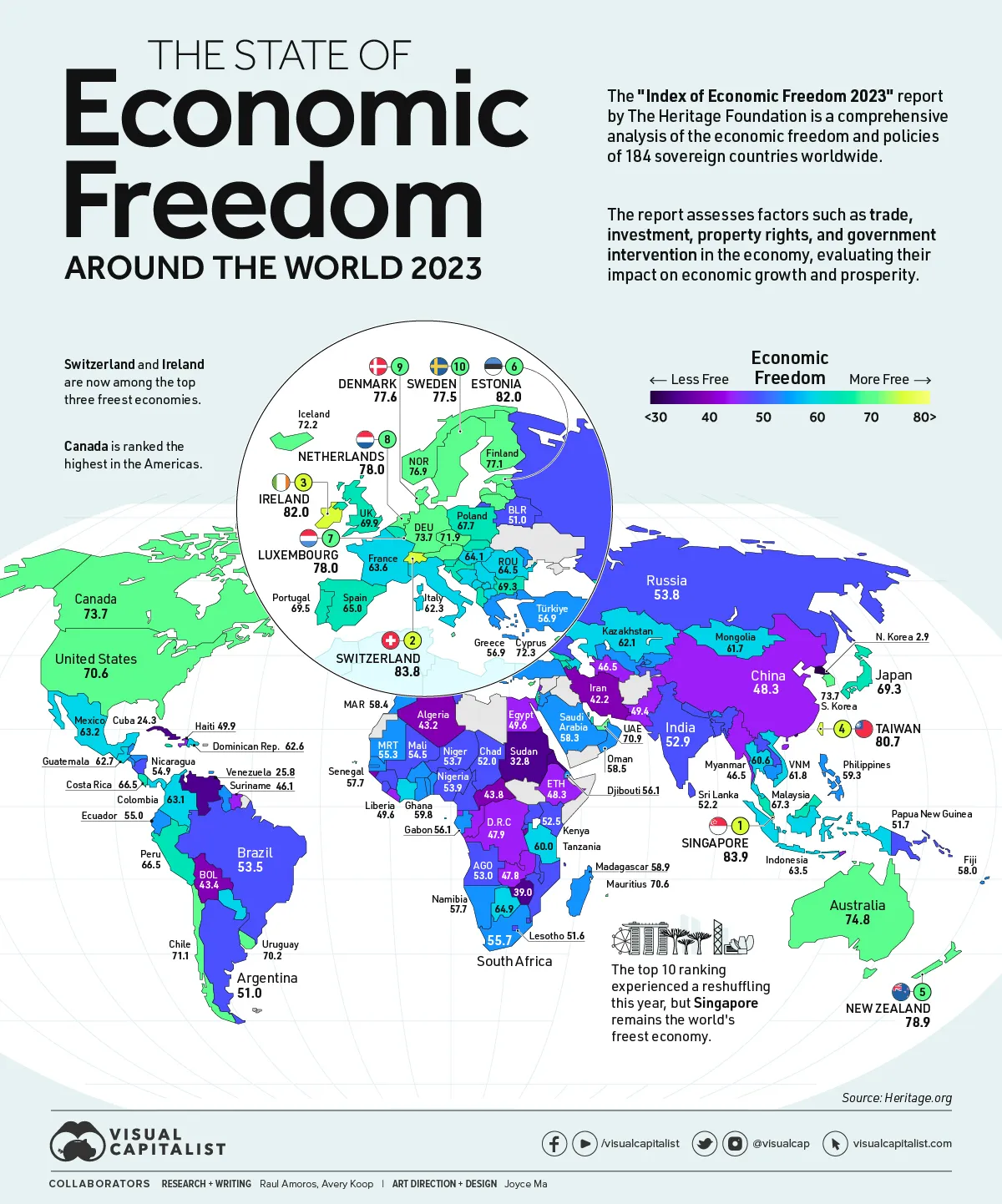The map above uses the annual Index of Economic Freedom from the Heritage Foundation to showcase the level of economic freedom in every country worldwide on a scale of 0-100, looking at factors like property rights, tax burdens, labor freedom, and so on.
