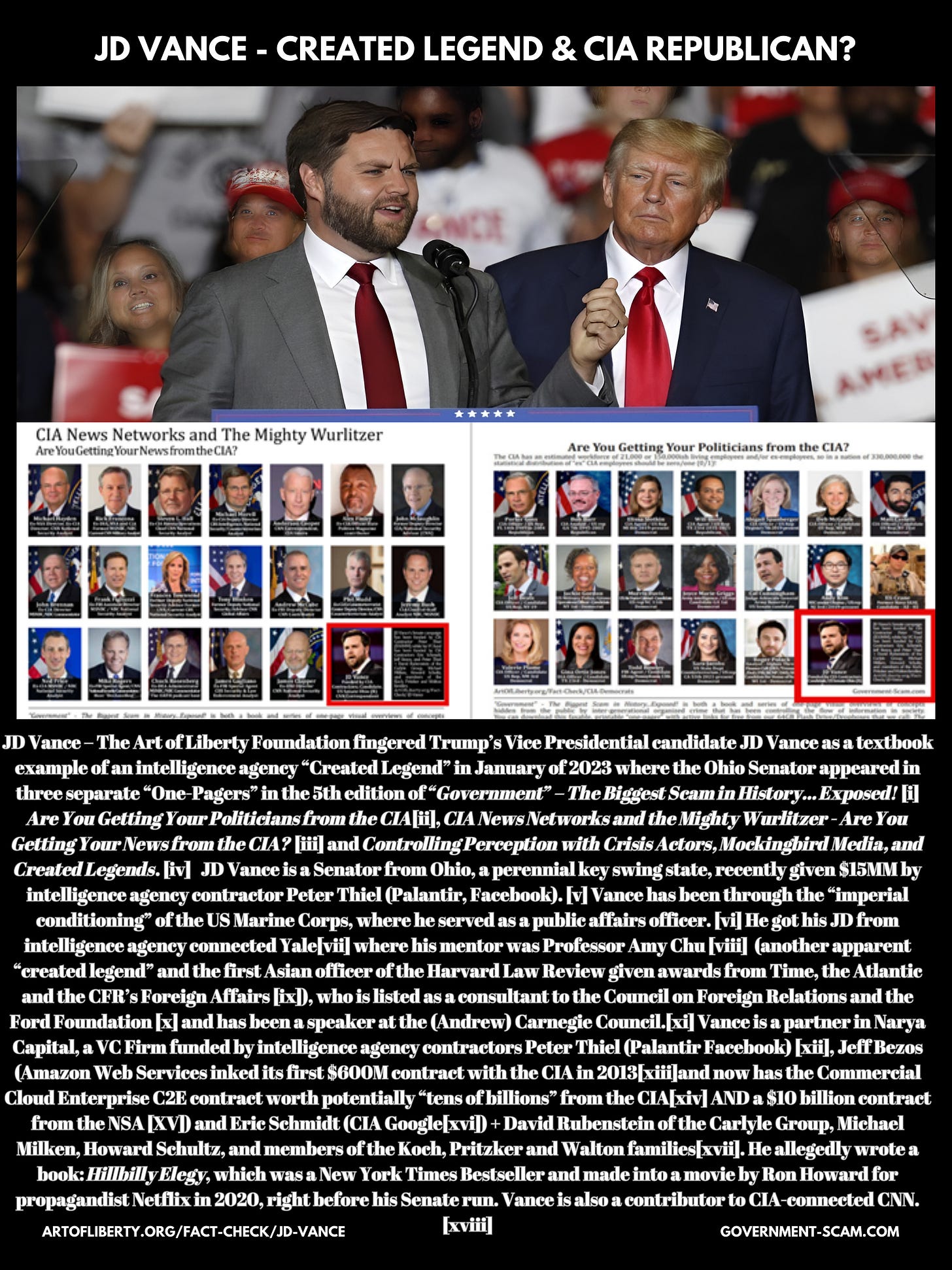 Etienne Note: One of my "claims to fame" is calling out JD Vance as a CIA "Created Legend" in January of 2023 in the 5th edition of my book: "Government" - The Biggest Scam in History... Exposed! where Vance is the only politician mentioned 3 separate times: 1st - As an example of the CIA CIA-installed politician, since his Senate campaign was funded by CIA contractor Peter Thiel to the tune of $15M and his VC fund was funded by CIA contractors: Peter Thiel, Eric Schmidt, and Jeff Bezos (among other shify characters). 2. As an example of a CIA media asset since he was made a commentator on CIA CNN and 3. As an example of a CIA "Created Legend" where his (Ghost Written?) book was made a "New York Times Bestseller" and turned into a Hollywood movie that premiered right before his Senate run. This was waayy before he was installed as Vice President even though he had called Trump "America's Hitler" and said he would rather write in his dog. In this clip I am adding to illustrate a Doug Casey breakdown of Vance in the Daily News by the Art of Liberty Foundation, Nick Fuentes drops some bombshells from JD Vance's background. Get our breakdown of Vance here: https://artofliberty.substack.com/p/trump-picks-ciacnn-connected-created