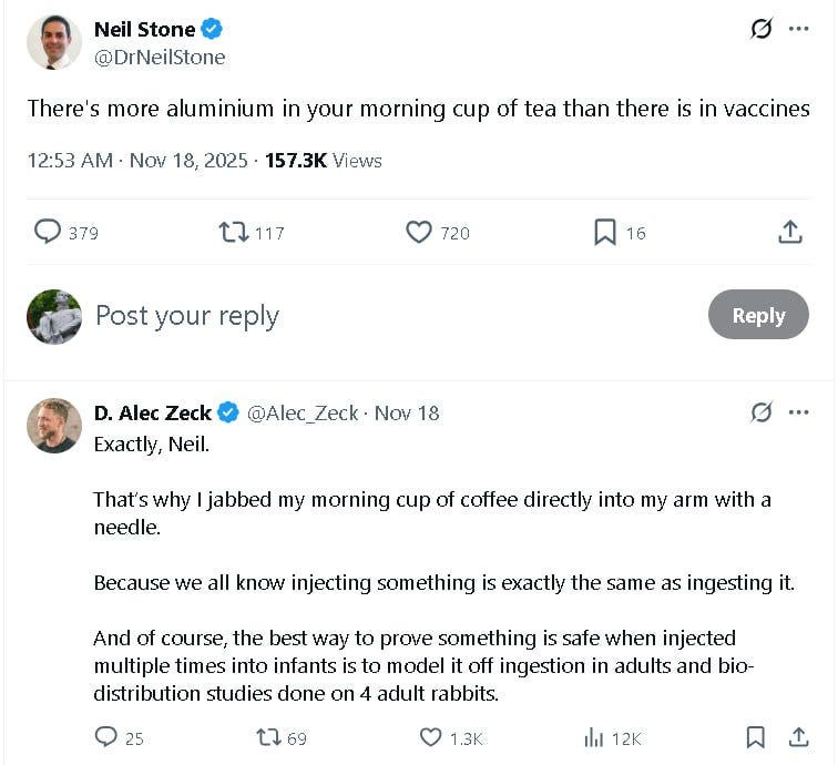 “The amount of aluminum in select vaccines is up to 72 TIMES LESS aluminum than you ingest daily from foods and up to 400 TIMES LESS aluminum than is in your body at any time. Oh and it’s ALL filtered and excreted by your kidneys in the SAME EXACT WAY.”