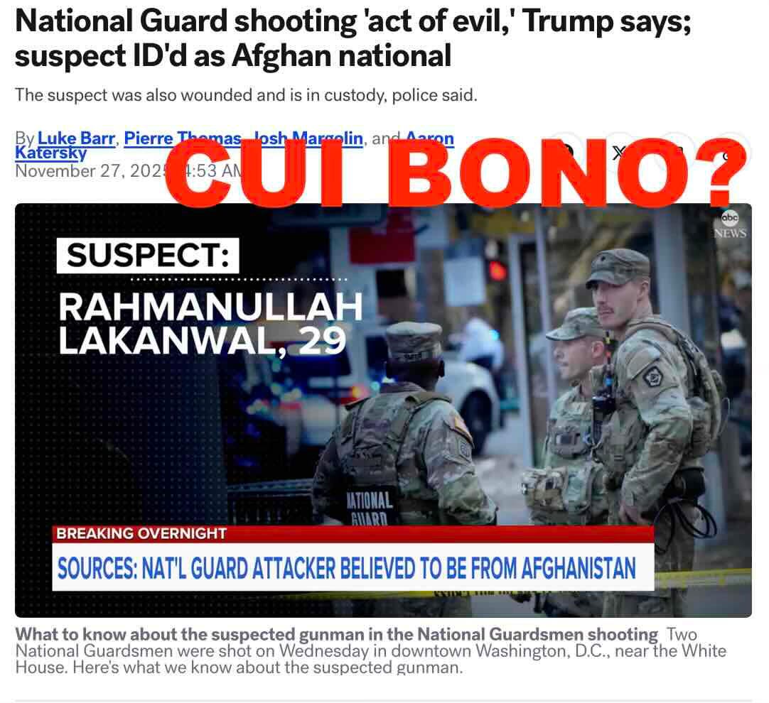 *CUI BONO? Trump called the attack “terrorism,” meaning it was a strategically-conceived violent act against civilians (?) designed to accrue political gain for the perpetrators. (That’s the definition of terrorism, which has been an all-too-common military tactic throughout thousands of years of history.) But since all terrorism is strategic, what, specifically, was the strategic purpose of whoever was behind this shooting? The question answers itself: Trump and his agenda were the primary beneficiaries. The President got to bloviate on Thanksgiving Eve, calling the shooter an “animal,” while posing as the protector of the nation in general and its capital in particular. His order to send the National Guard to Washington DC seems vindicated by the purported “radical Afghan Muslim terror attack.” (Hegseth used the attack as an excuse to send 500 more guardsmen into DC.) And Trump’s anti-immigration agenda got a huge boost as Trump was handed an excuse to issue an order: “Processing of all immigration requests relating to Afghan nationals is stopped indefinitely pending further review of security and vetting protocols.”
