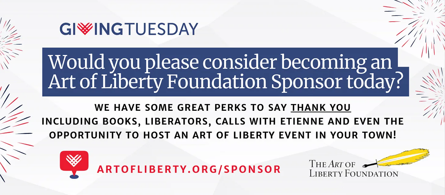 1. Become an Art of Liberty Foundation Sponsor at ArtOfLiberty.org/Sponsor - The best way to support us is to become a sponsor of the foundation. We have some great perks to say Thank You! including copies of “Government” - The Biggest Scam in History... Exposed!, Liberator Flash Drives, Signed Hard Copies, calls with Etienne, and even the ability to have an Art of Liberty Foundation event with tier one Liberty speakers in your City or Town for your friends, family and neighbors!