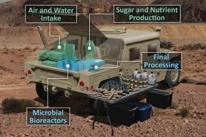 The Johns Hopkins Applied Physics Laboratory is home to one of four teams selected for the Defense Advanced Research Projects Agency’s (DARPA) Cornucopia program, attempting to unlock the potential to produce nutritionally complete, palatable foods in the field. The group is using electricity to capture water, carbon dioxide, nitrogen and trace minerals from the air and then producing a rich, glucose-based material (called feedstock) on which to grow microbial food products.