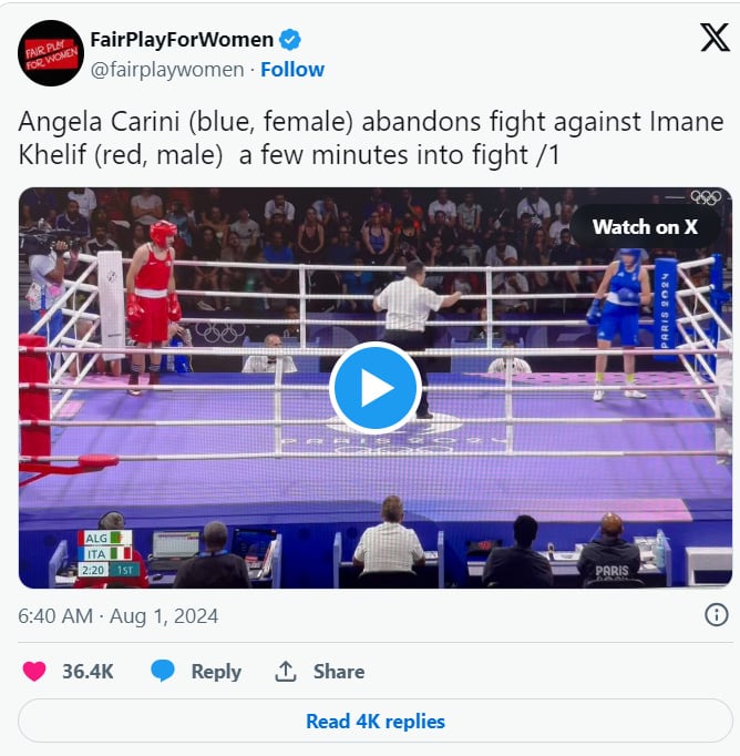 Khelif disposed of opening-round opponent, the Italian Angela Carini, so quickly, that if you blinked, the fight was over. Just like that. Pooooof. Done. Like it never happened. Carini forfeit the fight after taking two shots to the head in the opening seconds.