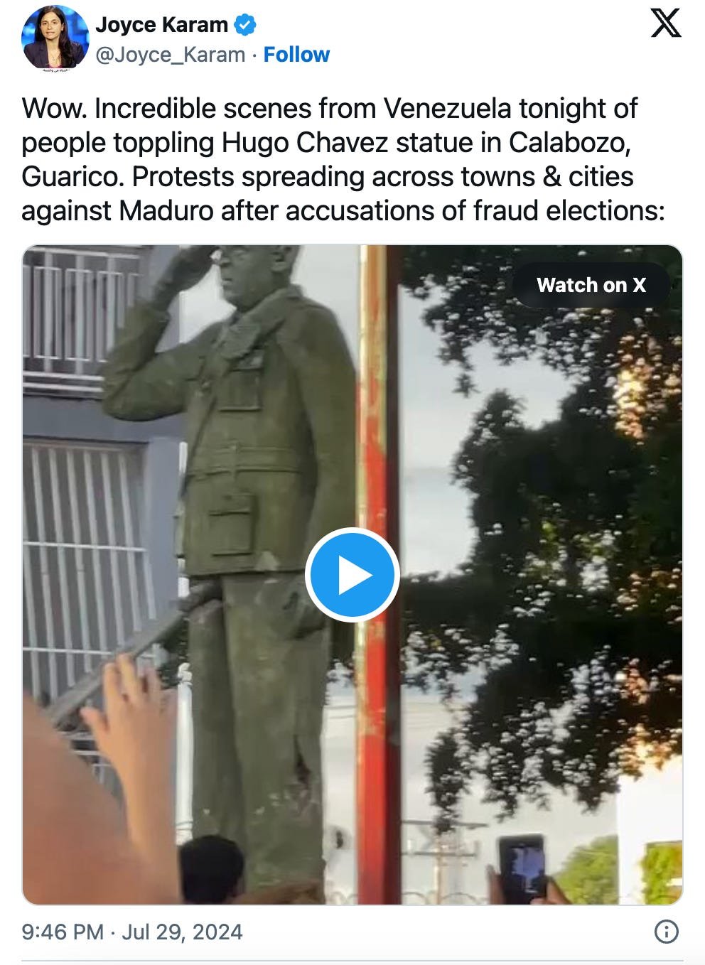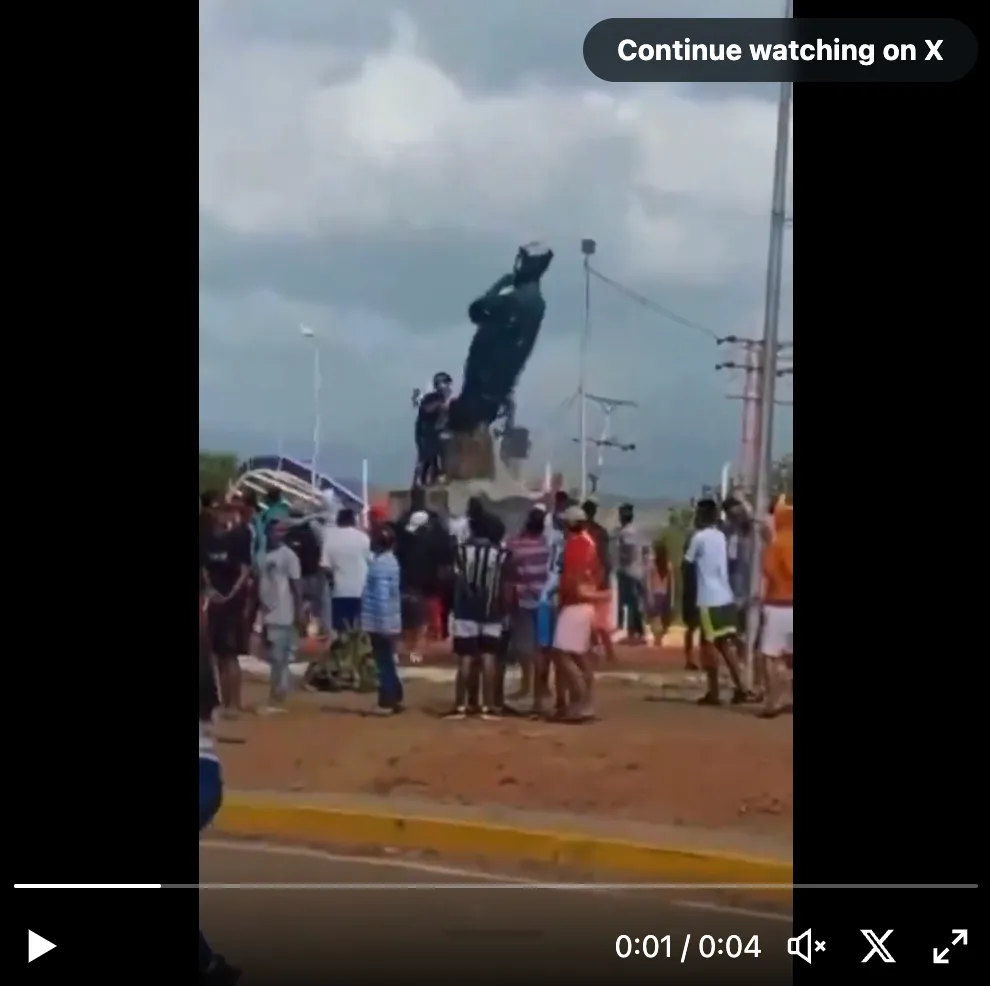 "Thousands of people descended on central Caracas on Monday evening, some walking for miles from slums on the mountains surrounding the city, towards the presidential palace," writes BBC. A handful of other cities have also witnessed unrest Monday, confirms CNN: "Protests were also reported in other cities, including Maracay, where opposition activist Esthefania Natera told CNN that people were on the streets "to yell and demand to tell the truth because we know the real results." The coastal state of Falcón saw demonstrators topple a statue of leftist icon and Maduro mentor Hugo Chavez, according to activists posting video on social media.