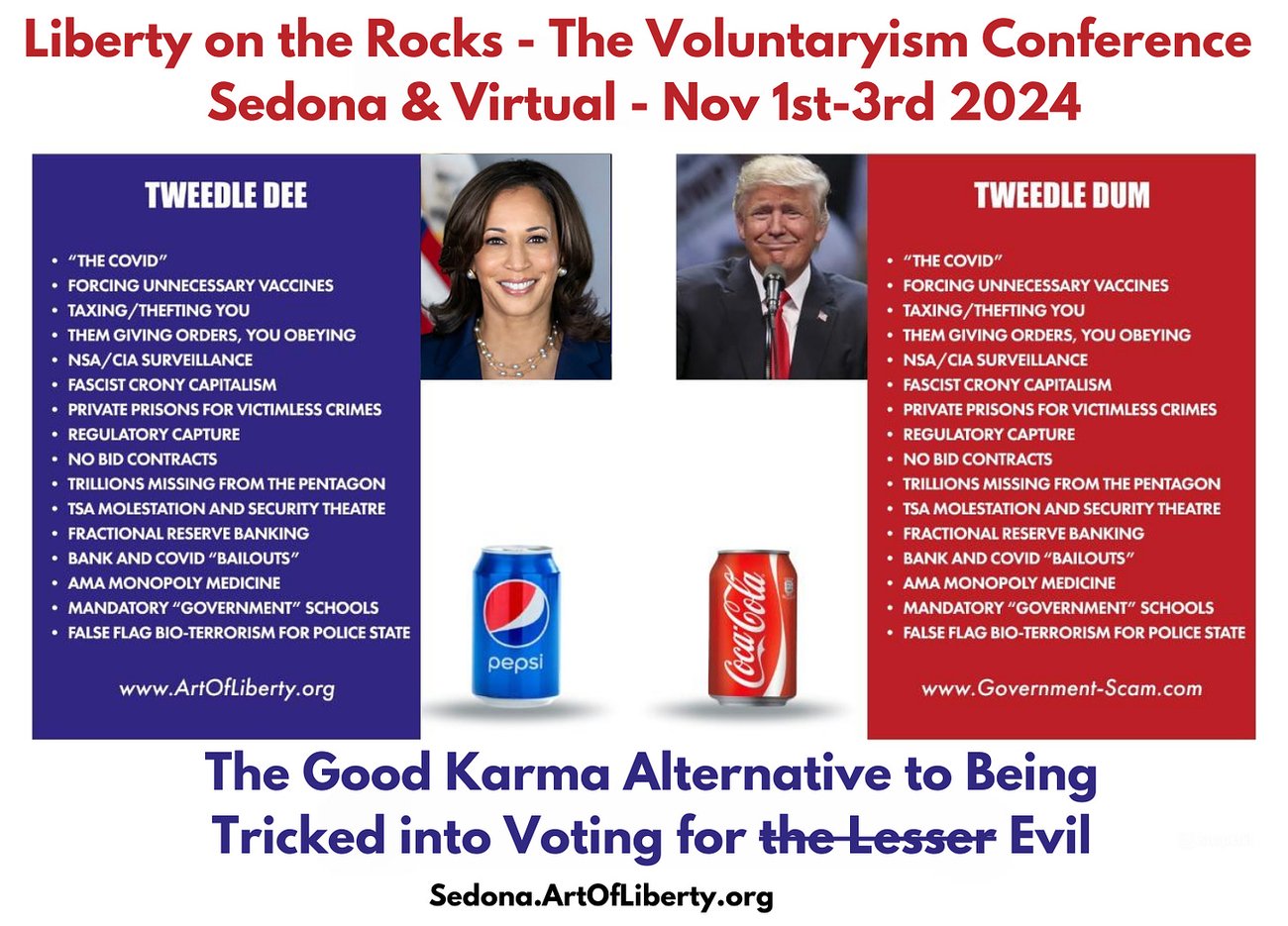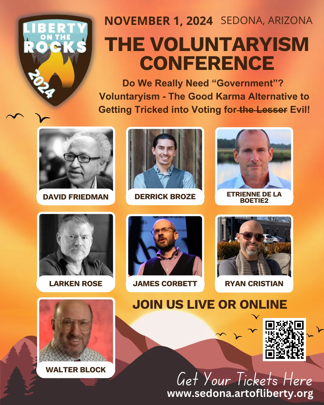 Voluntaryism! We officially launched our Liberty on the Rocks- Sedona - The Voluntaryism Conference this week! The conference will be held on November 1-3 in Sedona and streamed live globally. We are bringing together leading voluntaryists including David Friedman, Larken Rose, Etienne de la Boetie2, James Corbett, Walter Block, and Derrick Broze. The goal is to both educate the population on how REAL freedom and the free market can replace “government” and give intelligent people an alternative to easily rigged, fake elections.