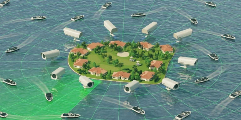 It's a hot morning on South Florida's Biscayne Bay, and I've convinced two local tour boat captains to pilot me around the perimeter of what is quite possibly the wealthiest and most heavily defended town in America. I'm not entirely clear on the rules about boating near the island, which lies just across the bay from Miami, and neither are my captains — they're both in their first weeks on the job. What I do know is that Indian Creek employs a new all-seeing security system and a small navy of police officers who frequently stop and ticket boats that venture too close to the island's manicured shore.