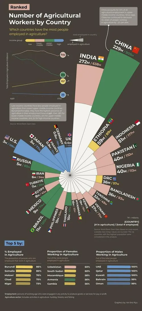 Using employment and population data from the World Bank, Visual Capitalist's Bruno Venditti and Eiri Ryu created the following graphic to rank the distribution of agricultural workers in the world’s most populated countries.