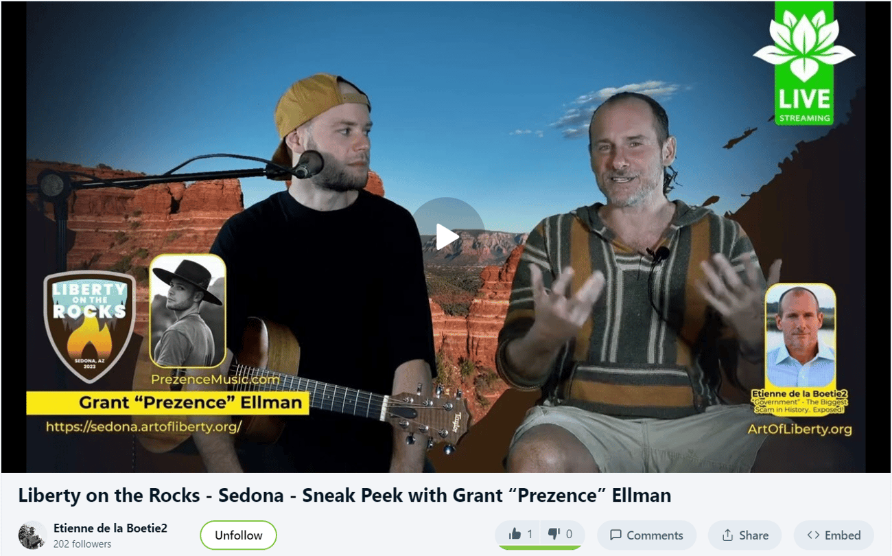 Grant "Prezence" Ellman and Etienne did a quick preview of Liberty on the Rocks - Sedona coming up on Nov 3-5th and then Grant did a couple of songs including "Scam". This video was censored off YouTube a couple of hours after it was published but was automatically backed up to Rumble here: https://rumble.com/v3s2lwj-liberty-on-the-rocks-sedona-sneak-peek-with-grant-prezence-ellman.html Etienne sang along...