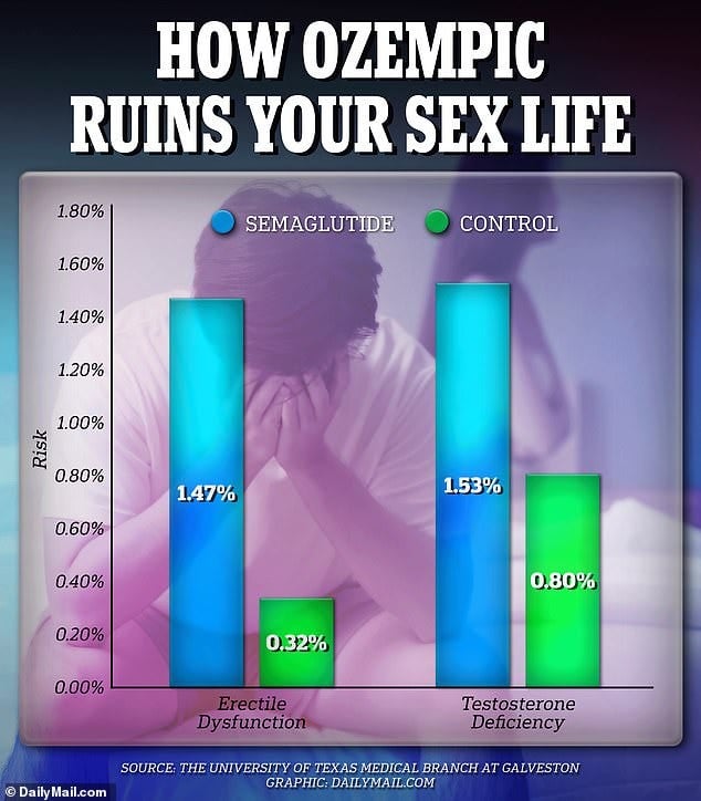 The researchers found that, not only did semaglutide users have a three and a half times increased risk of the sex problem, they were also almost twice as likely to develop testosterone deficiency