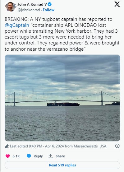 "They had 3 escort tugs but 3 more were needed to bring her under control. They regained power & were brought to anchor near the verrazano bridge," the tugboat captain told Konrad.