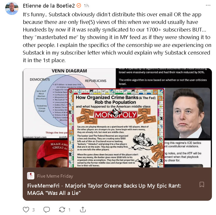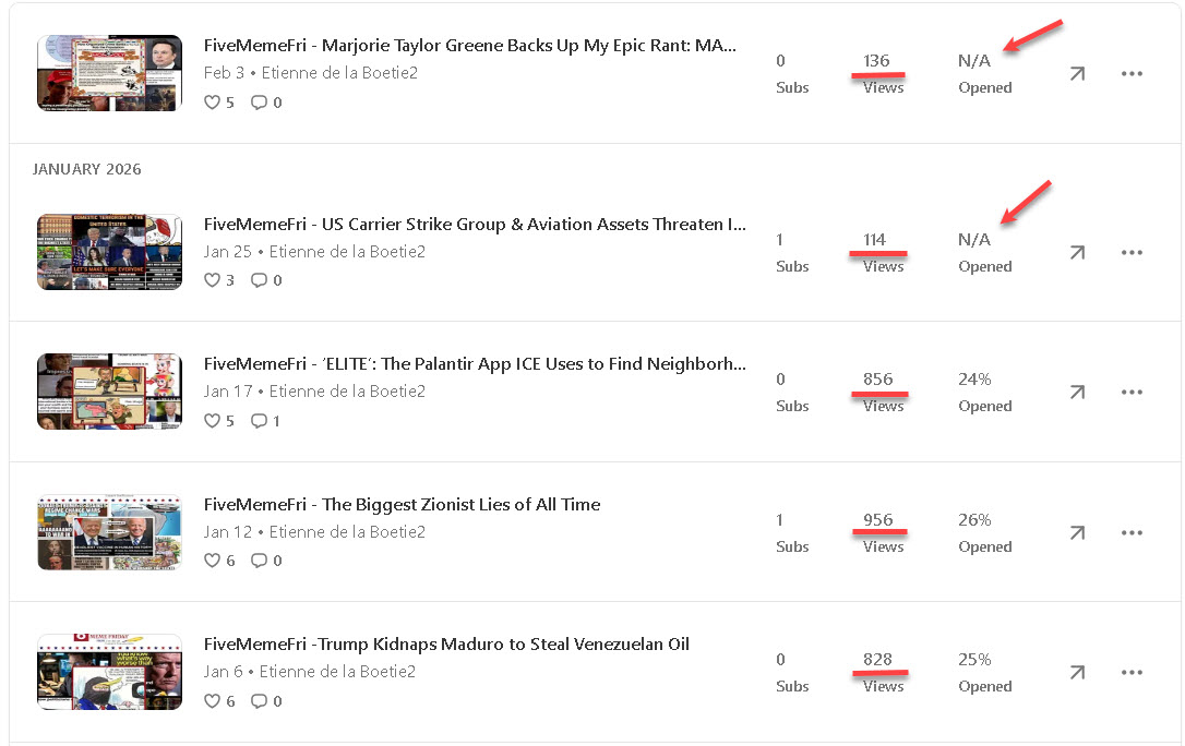 In the last issue of Five Meme Friday, I shared in my subscriber letter how Substack began censoring us after they received $100M from some shady “investors” in July of 2025. I shared screenshots how our (and OTHER liberty-oriented creators) saw our revenue and subscribers fall dramatically at the exact same time.
