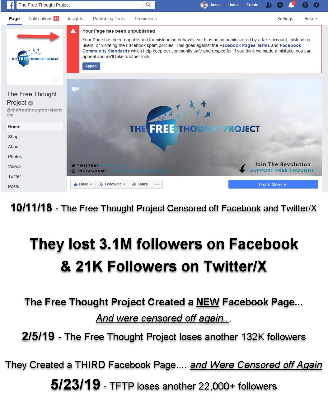 Jason Bassler of The Free Thought Project had a considerable head start on us and had amassed over 3.1 MILLION followers on Facebook before that platform began censoring in 2018. They deleted ALL of his followers on October 11th 2018. Twitter deleted his account with 21,000 followers on the same day AND they got a strike on their YouTube account on the same day showing coordination between ostensibly independent and unaffiliated platforms.
