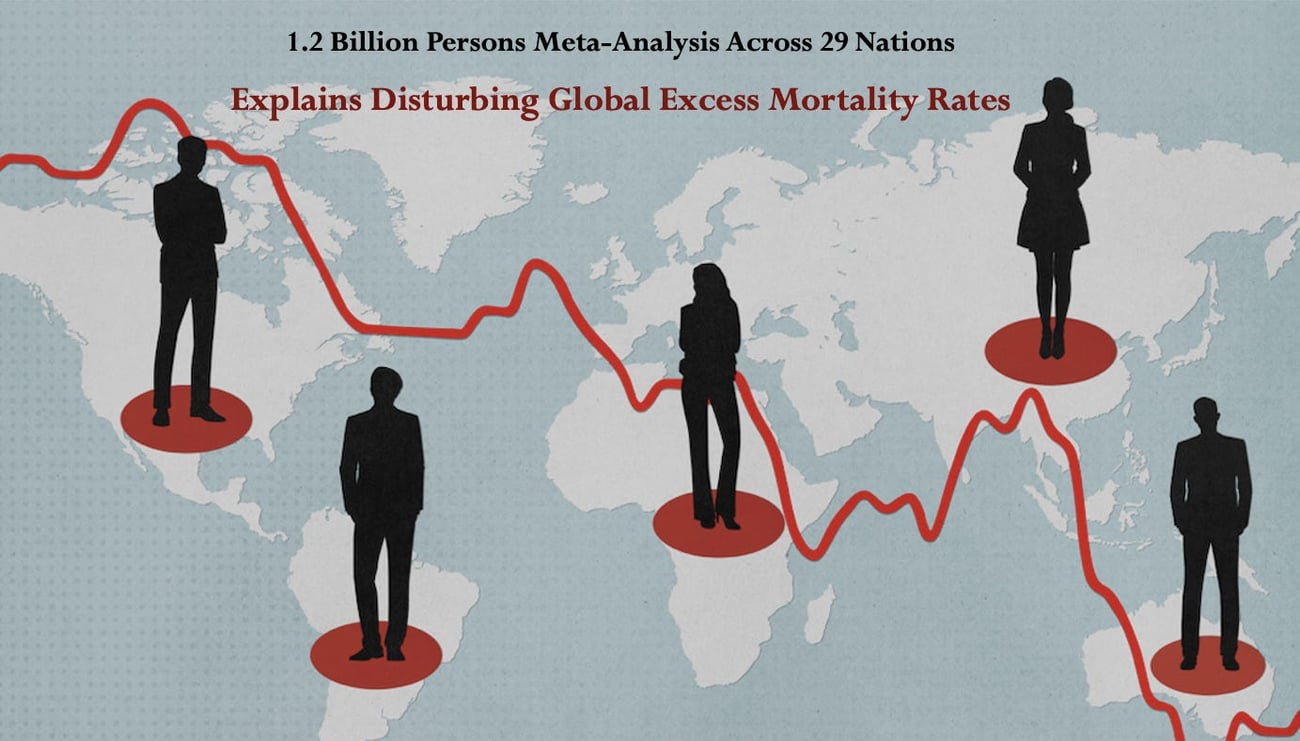 May 30, 2024: While ‘COVID-19 vaccines’ were originally hailed to be life-saving medical countermeasures, by the end of 2023 global excess mortality rose to more than 3 times than that of COVID-19 itself per a recent 3-year meta-analysis. This exhaustive analysis represents an astonishing 1.19 billion persons across 29 nations (14.7% of the global population).