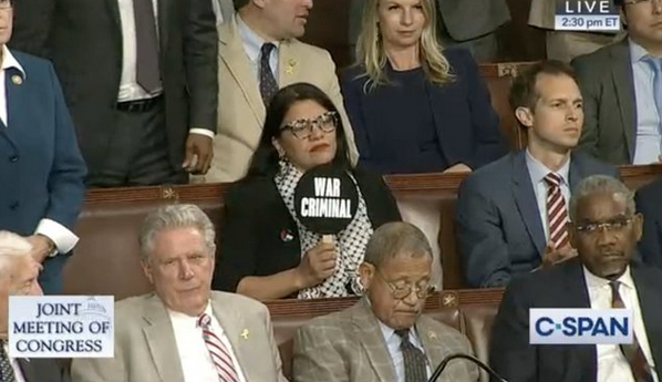 During Benjamin Netenyahu's speech to the US Congress, Rep. Rashida Tlaib, the only Palestinian American in Congress, held up a sign that read "war criminal" on one side and "guilty of genocide" on the other while the rest of the organized crime Congress gave him standing ovation after standing ovation...