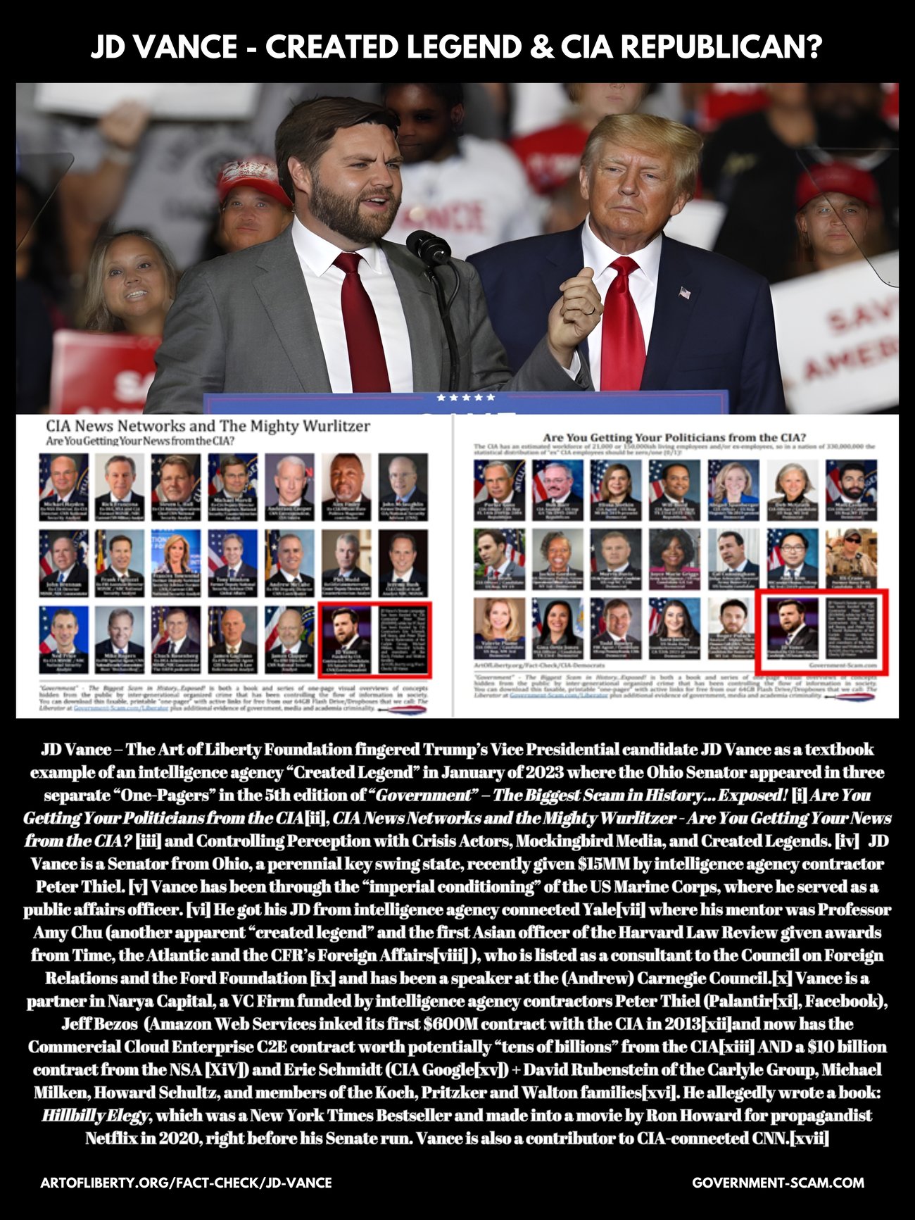 We have updated our JD Vance - CIA "Created Legend" Meme now that he has been elevated to Trump's Vice Presidential pick. The fact-check page with references will be updated tomorrow. For those that missed last week's issue and our article: Trump "Picks" CIA/CNN-Connected “Created Legend” JD Vance as Vice President... After Vance Called him a "Total Fraud" & "America's Hitler", the Art of Liberty Foundation fingered Vance as an intelligence agency "Created Legend," CIA "Mockingbird Media" CNN commentator and CIA-installed politician in the 5th edition of "Government" - The Biggest Scam in History... Exposed! He was the only politician to appear in three separate "one-pagers" in the book and I am predicting that he will be installed as a CIA puppet President in 2028.