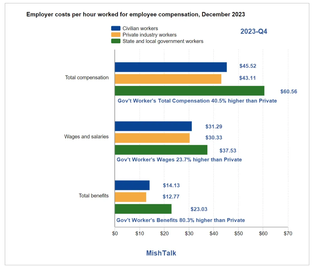 State and local government worker’s benefits are $23.03 compared to $12.77 for private industry.