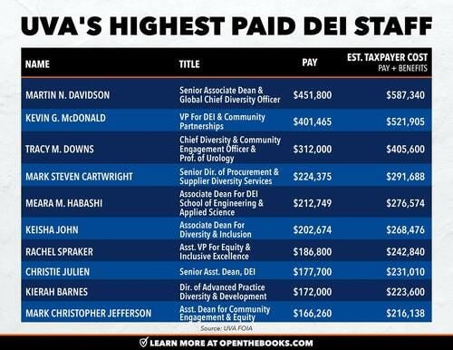 University Of Virginia Spends $20 Million On 235 DEI Employees, With Some Making $587,340 Per Year
