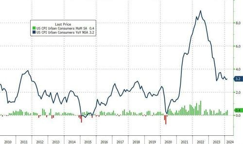 After January's surprised upside shift, expectations have been adjusted up over the last month for another sizable MoM move in headline CPI. But that was not enough as the 0.4% MoM rise in the headline (as expected - highest since August) lifted CPI YoY up to +3.2% (hotter than the 3.1% exp)...