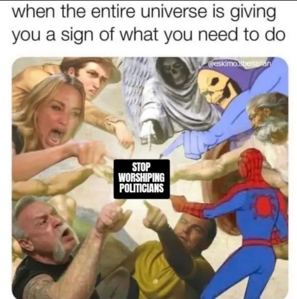 If you aren't getting your news from openly voluntaryist sources STRIKING THE ROOT by exposing the illegitimacy of the "government" on its face AND controlled opposition media operations like Tim Pool, Luke Rudkowski, Tucker Carlson, and Alex Jones then you are likely focused on the cape instead of the matador.