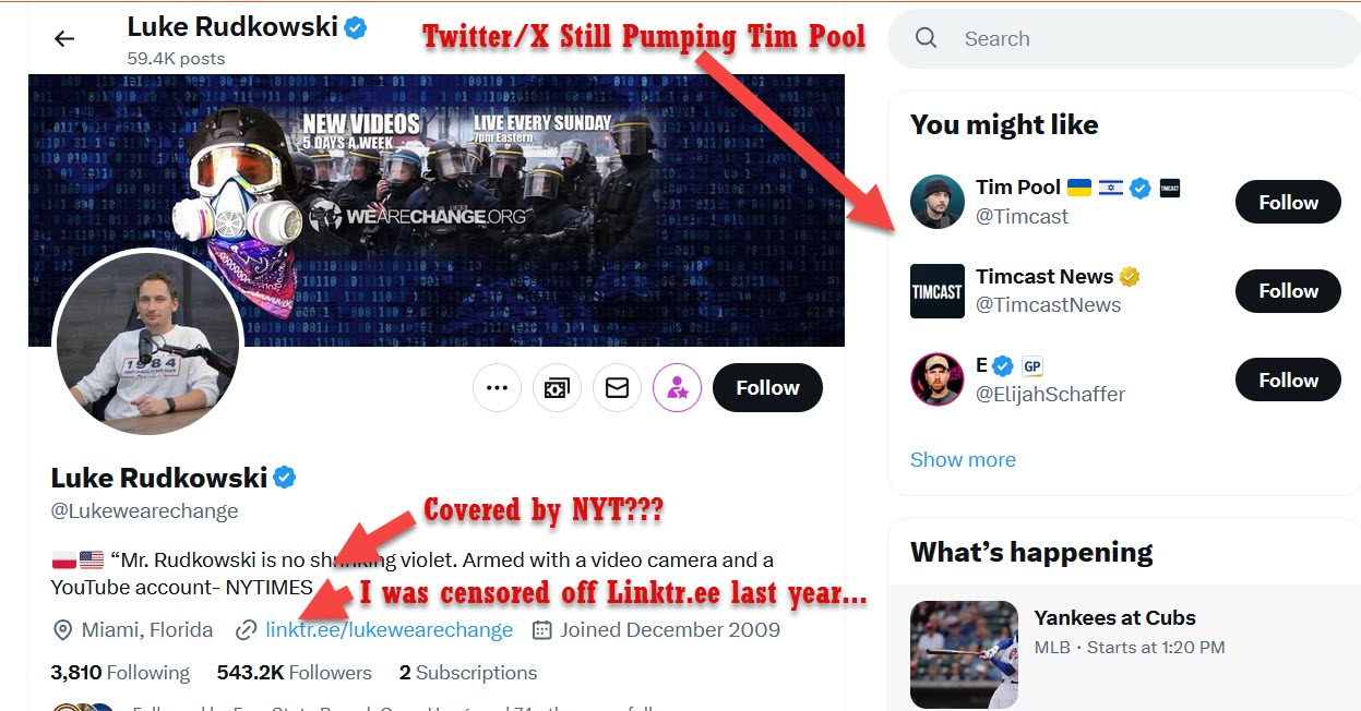 Tim Pool and Timcast News still being recommended by DARPA Elon's Twitter/X while Luke Rudkowski's X Profile displays his New York Times coverage
