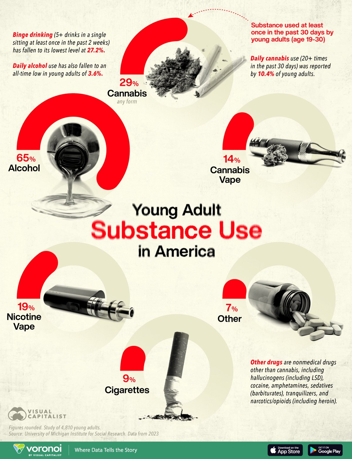 This graphic shows young adult substance use in America, based on data from the University of Michigan Institute for Social Research.