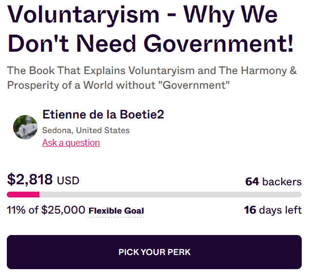 Our IndieGoGo for my new book: Voluntaryism - How the Only “ISM” Fair for Everyone Leads to Harmony, Prosperity and Good Karma for All! has raised $2818 from 64 backers or 11% of our $25,000 goal with 16 days left! You can get some great perks for pre-ordering at https://www.indiegogo.com/projects/voluntaryism-why-we-don-t-need-government