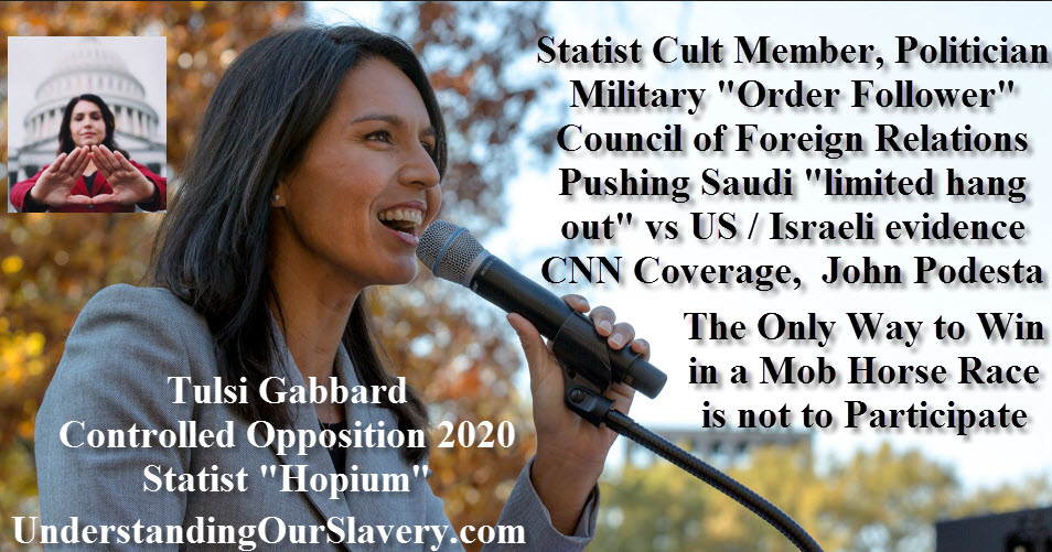 In not so good news, someone at the Free State Project keeps populating their events with controlled opposition "savior" politicians like Tulsi Gabbard or RFK Jr. OR folks like Vermin Supreme who make everyone associated with the Free State Project look bad... Here is a meme I created years ago exposing some things about Tulsi. Statism is the indoctrinated belief in having a "government" and that old time religion seems to die hard in some... "Order Followers" are those who set their morality aside and agree to kill whomever they are told for a paycheck OR enforce the laws... nay "commandments" of an artificially indoctrinated Statist religion on their friends, family and neighbors...The John Podesta comment in the meme refers to Wikileaks e-mails that suggest that Podesta is running Tulsi as a bought and paid for politician.. Search Engine those terms for the details... Why are we inviting a politician and soul-dier who has been living on money stolen from folks at the point of a gun? Who at the FSP made her the keynote? Email me at Evidence@ArtOfLiberty.org if you know...