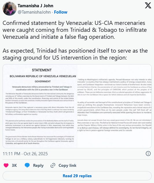 Venezuela “reports that it has captured a mercenary group with direct information from the US intelligence agency, CIA, being able to determine that a false-flag attack is underway from waters bordering Trinidad and Tobago, or from Trinidad or Venezuelan territory itself,” the Venezuelan government said in a statement.