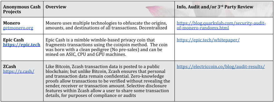Unlike Bitcoin, whose transactions are visible on a public blockchain, anonymous digital cash refers to crypto-currency projects that use a variety of technologies to obfuscate the origins, amounts and destinations of all transactions while maintaining the decentralized nature that prevents take-downs and the verifiability of transactions that prevents double-spending, counterfeiting and inflation
