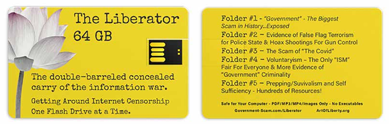 The Liberator - www.Government-Scam.com/Liberator - The Art of Liberty Foundation’s collection of flash drives and Dropboxes that both expose the organized crime’s illegitimacy, illogic and criminality and provide the healthy alternatives or voluntaryism, free markets, tolerance, and peace. The Liberator drives includes the ePub of “Government” – The Biggest Scam in History... Exposed! with active links of this book and a curated curriculum of the best books, short videos, and documentaries to take someone from “0-60” on the most important topics in the world. You can download for free at Government-Scam.com/Liberator and burn your own for friends and family!