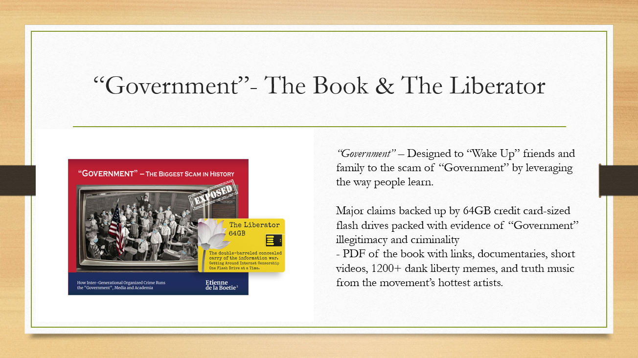 Go paid at the $50 a year level, and we will send you a free paperback edition of Etienne’s book “Government” - The Biggest Scam in History… Exposed! AND a 64GB Liberator flash drive if you live in the US. If you are international, we will give you a $10 credit towards shipping if you agree to pay the remainder.
