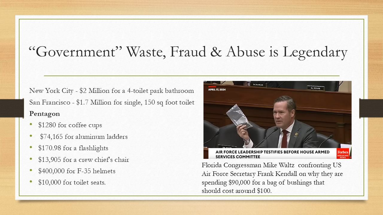 Now, another example of that is government waste, fraud, and abuse, and it is legendary. It is frankly stunning how much money the government wastes of the average person’s money without any care for the time, the effort, the toil, the blood, and the sweat, and the tears that you put into earning that money. They will just throw it away in the most ridiculous ways. These are just a couple of examples. I could have gone on for slide after slide after slide.