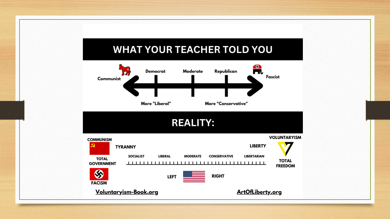 So, if you wanted to look at the political spectrum that way, you would have communism and fascism as total tyranny, and you would have voluntarism as total or REAL freedom.