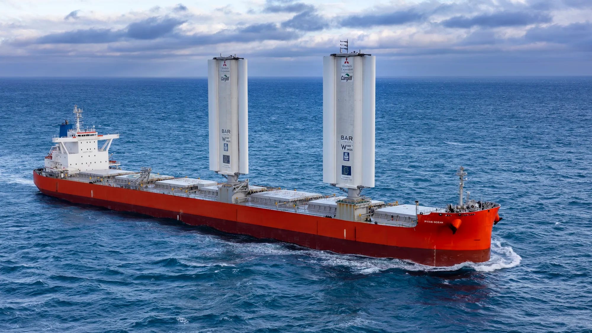 Pyxis Ocean sailing through the English Channel from Spain to Amsterdam, March 2024 using 123 foot “Wind Wings” to reduce fuel consumption on average 3.3 tons of fuel each day.