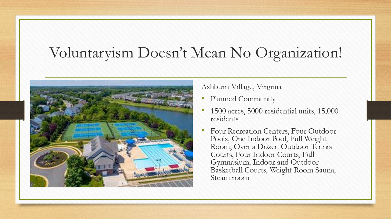 This is where I used to live in Virginia. It’s called Ashburn Village: 1,500 acres, 5,000 residential units, 15,000 residents. We had four recreation centers, four outdoor pools, one indoor pool, full weight room, a dozen outdoor tennis courts, four indoor tennis courts, full gymnasium, indoor and outdoor basketball courts, weight rooms, sauna, steam room—everything that you would expect from a government community center. The homeowners association manages everything. There's no violence or extortion. If you don’t want to live there, you can move and go someplace that doesn’t have those amenities. But that's all going on without “government”.