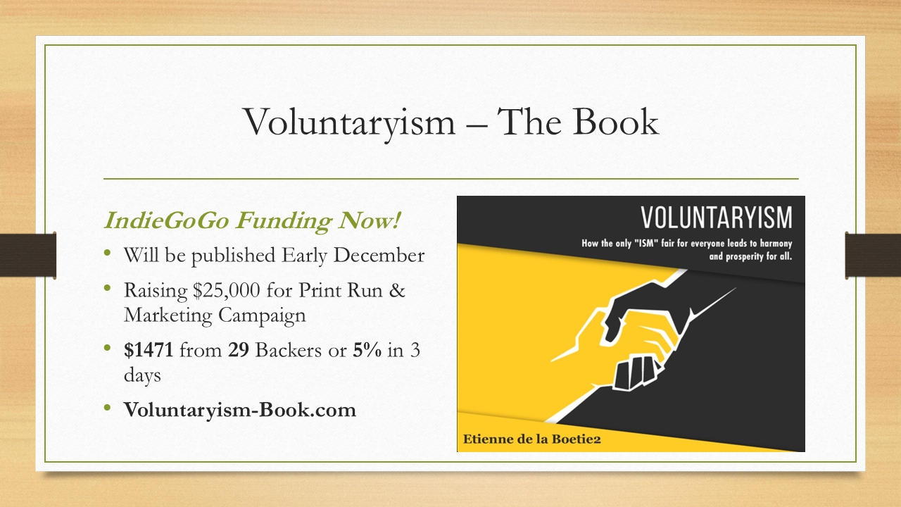 I'm going to talk about is my upcoming book, Voluntaryism - How the Only 'ISM' Fair for Everyone Leads to Harmony, Prosperity, and Good Karma for All. And what I mean by that is every other political “ISM”, whether it's communism, whether it's socialism, whether it's democratic republicanism…