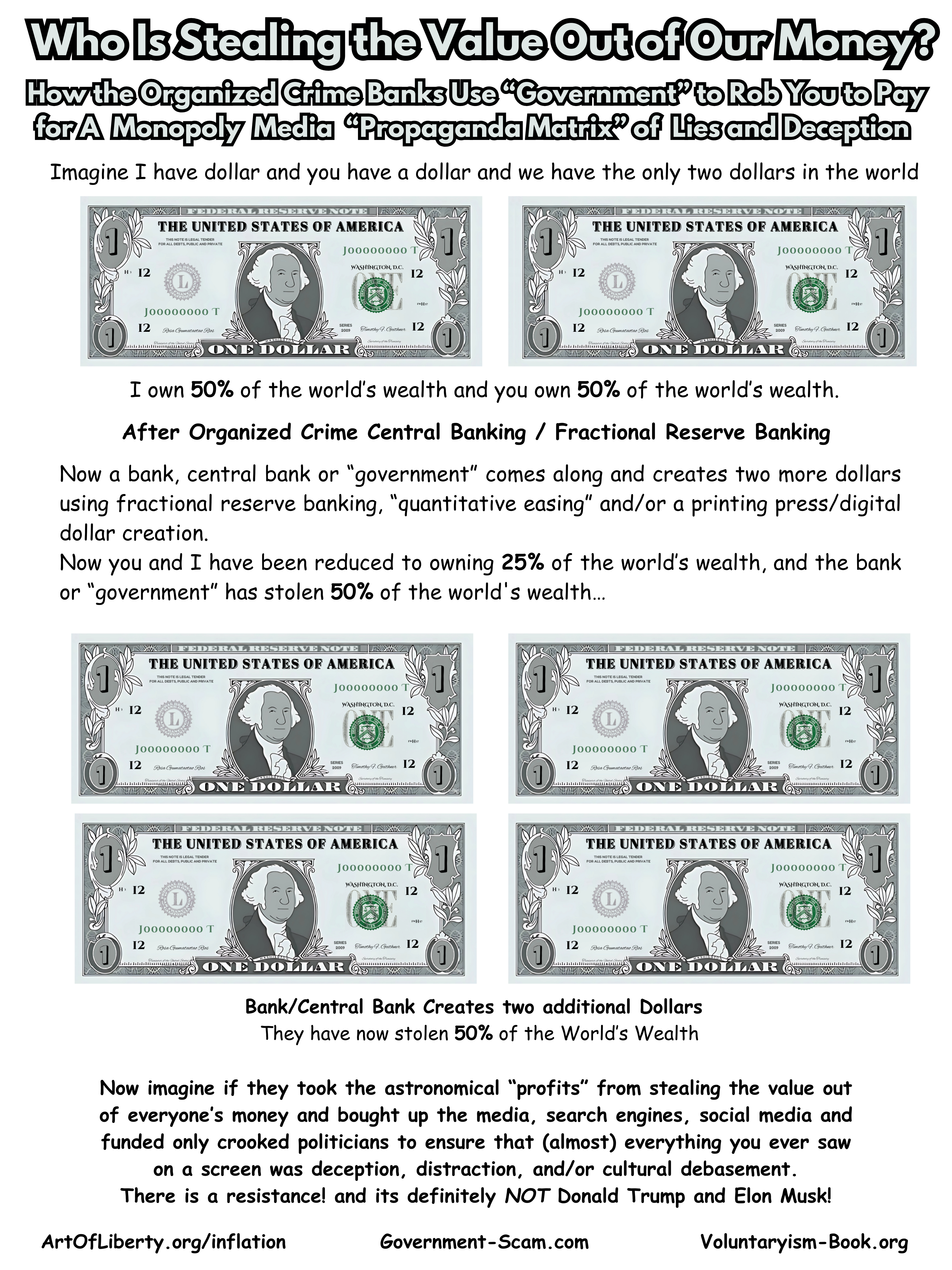 Every single year, you should be buying more and more and more with your dollars, but instead, prices are going up because the organized crime banks are stealing the value out of everybody else's money.