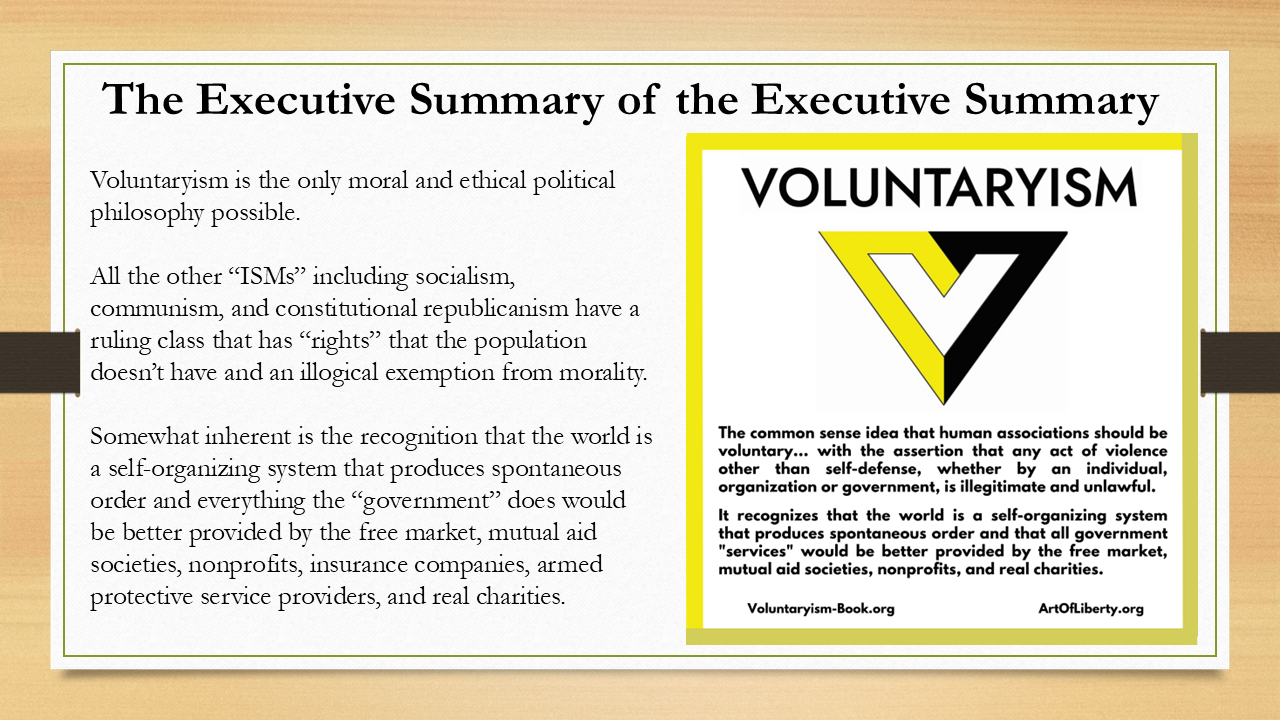 In short, voluntaryism is the common-sense idea that all human associations must be voluntary; that nobody has the right to use violence or extortion on anybody else, even if they're in the minority, even if they're a quote-unquote “government”, and the fact that they're using violence and extortion on peaceful people is a de facto proof that “government” is illegitimate on its face.