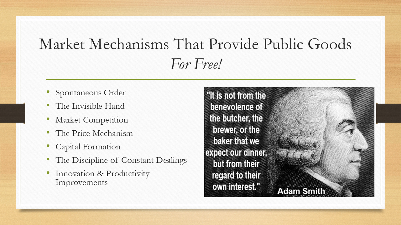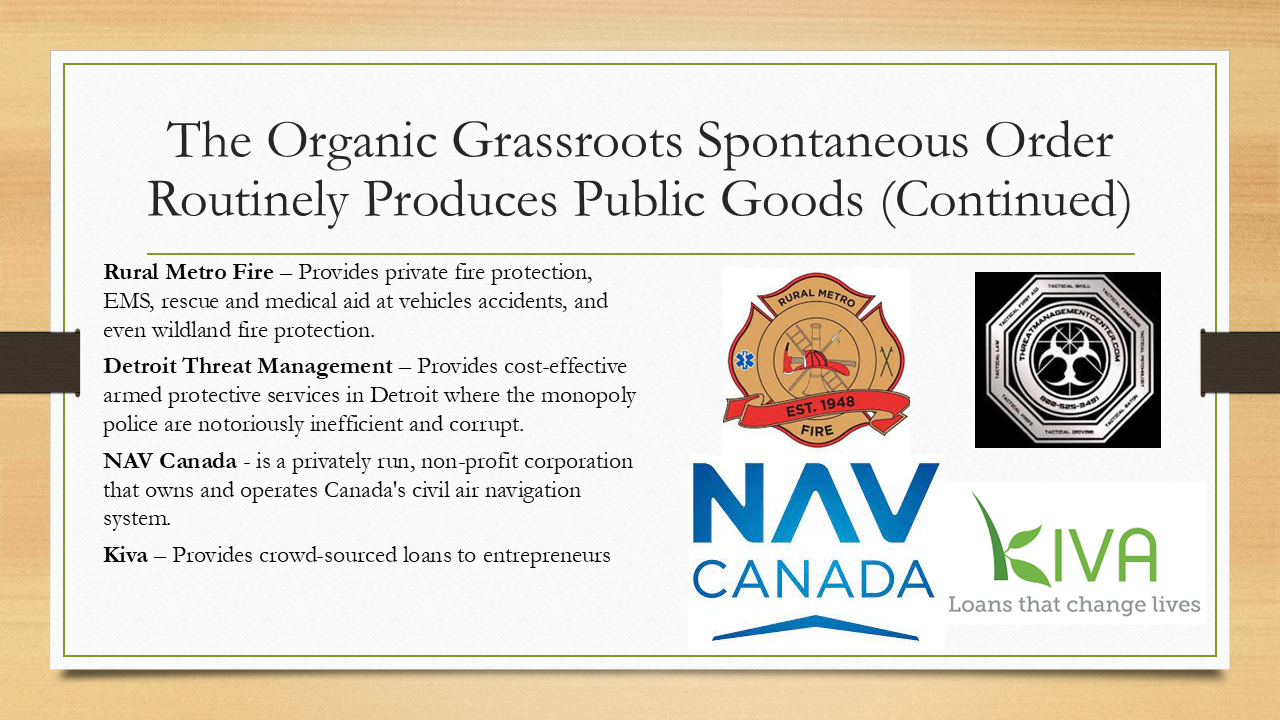Luckily, what economics teaches us is that there's a number of different market mechanisms that provide public goods, what we would consider public goods, many things that the government does for us today, for free, without any violence, extortion, waste, fraud and abuse of “government”.